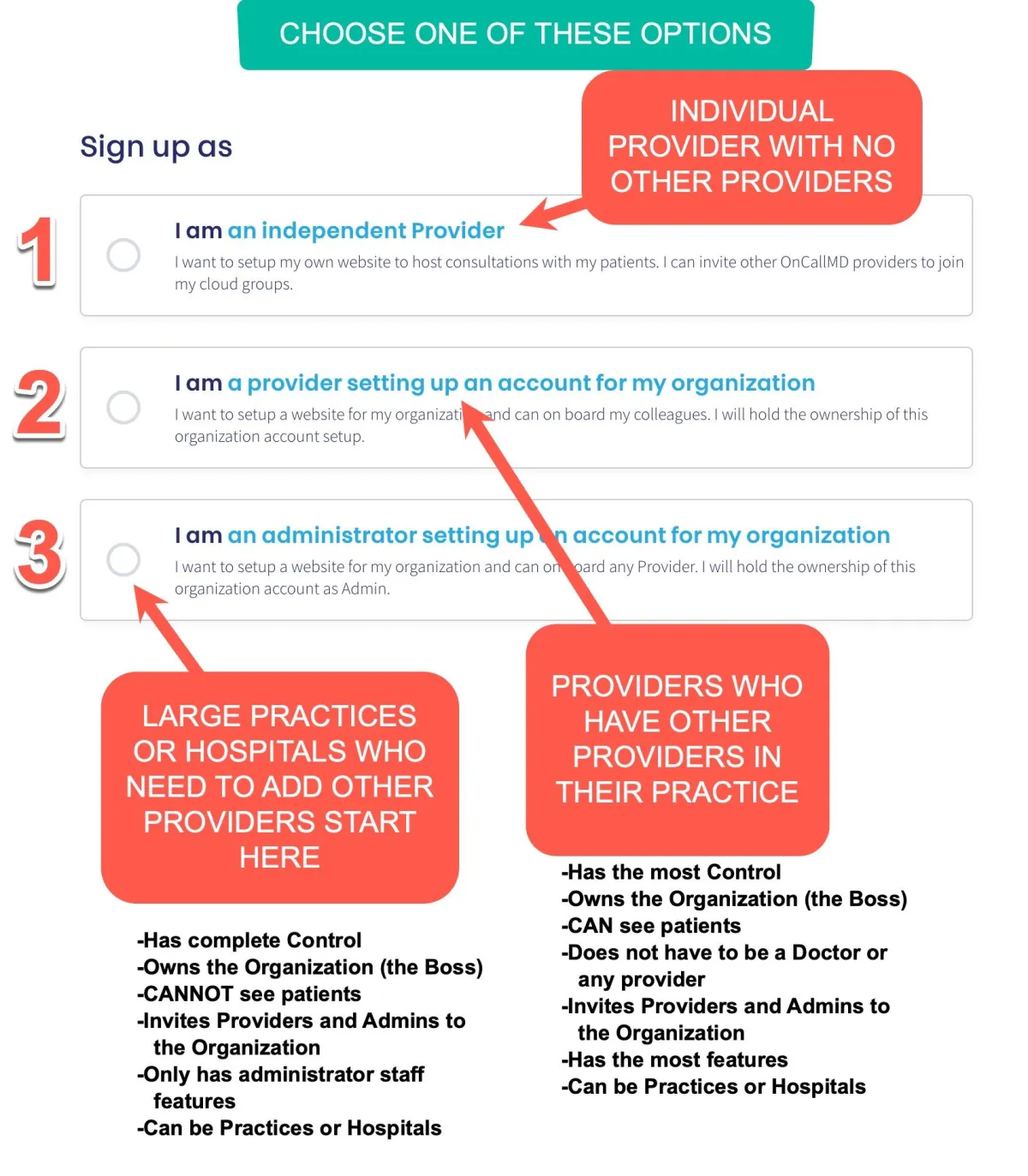 2-IF YOU ARE AN ADMINISTRATOR OF THE PRACTICE THAT WANTS TO SEE PATIENTS AND ALSO INVITE OTHERS IN THE PRACTICE TO PARTICIPATE IN TELEHEALTH CALLS WHILE HAVING COMPLETE CONTROL OVER THE SYSTEM, THEN CHOOSE #2. YOU WILL BE RESPONSIBLE FOR ADDING NEW PEOPLE AND MONITORING THEIR ACTIVITIES.